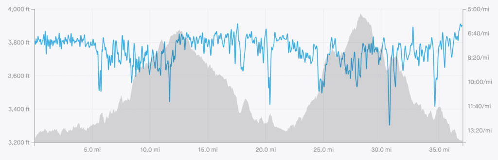 After a little mini out and back, you essentially head out on a 15-20 mile easterly loop and then head out on another 15-20 mile westerly loop. The 20 mile race only does the first loop. The first loop is faster terrain but the second is more aesthetically pleasing and takes you to a little higher elevation so that means you get a really nice long downhill to funnel you back to the finish. Here’s the route from my Strava entry when I ran it in 2019. Don’t be fooled by the appearance of the two climbs. They are only 600-800 feet a piece, but as you can tell, the second climb is a little more aggressive so keep that in mind.
